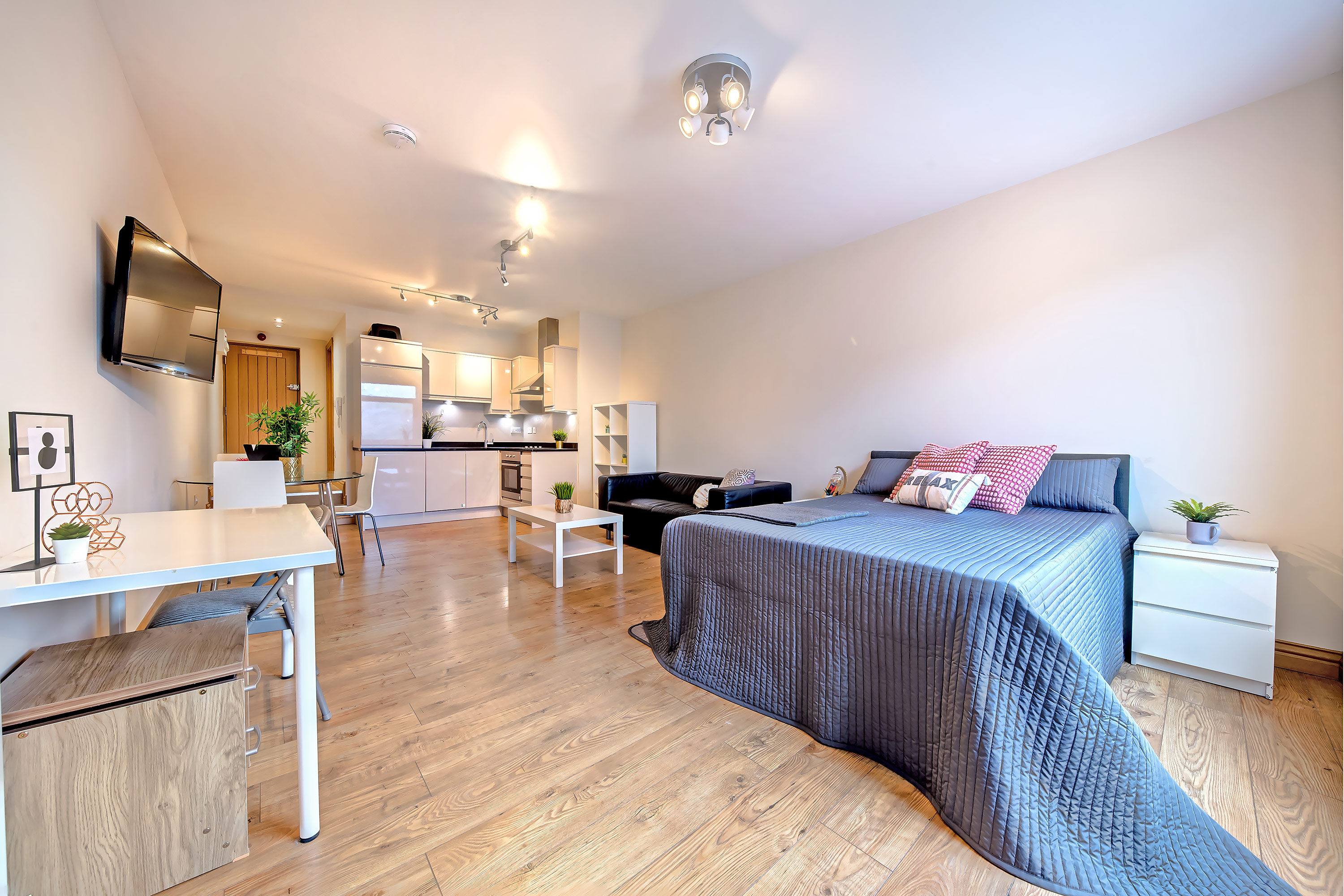 Double bed, desk, bedside tables and wardrobe all included