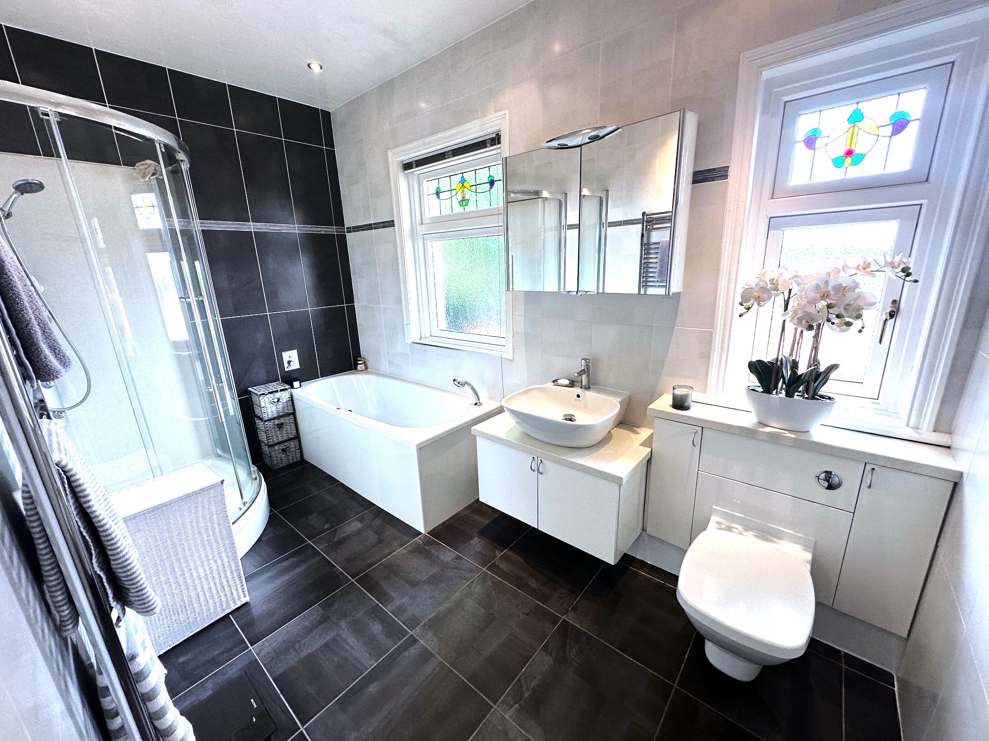 The stairs lead up to the generous first floor landing with original stained glass picture window and store cupboard | The landing then leads onto four bedrooms, three of which are comfortable doubles; bedrooms one and two are generous in size and offer beautiful open aspect views over the rear gardens and towards the Town Moor | Stylish re-fitted family bathroom with four piece suite