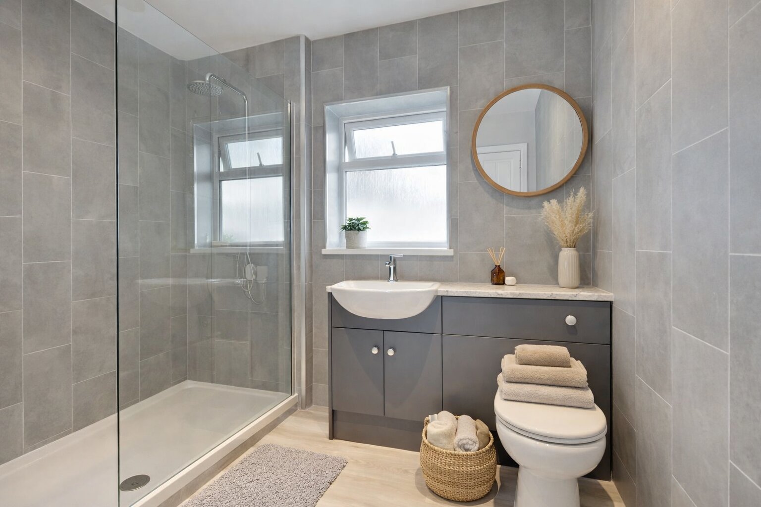 Stylish bathroom: The white bathroom suite features an overhead shower and modern fittings.