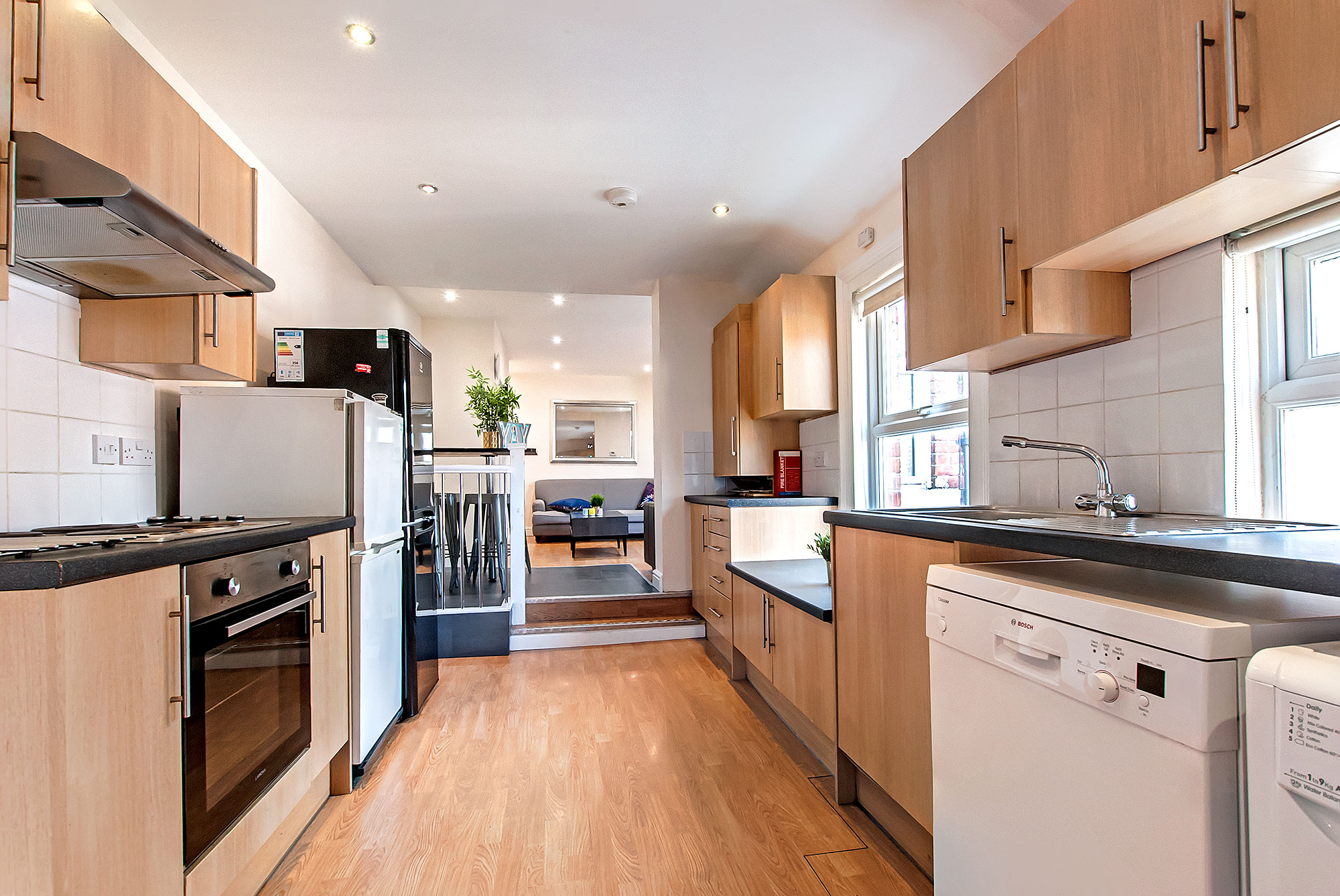 Newly Developed Open Plan Living Space with Breakfast Bar and Luxury Lighting, spacious 6 bed upper maisonette on one of Jesmond’s most sought after streets.