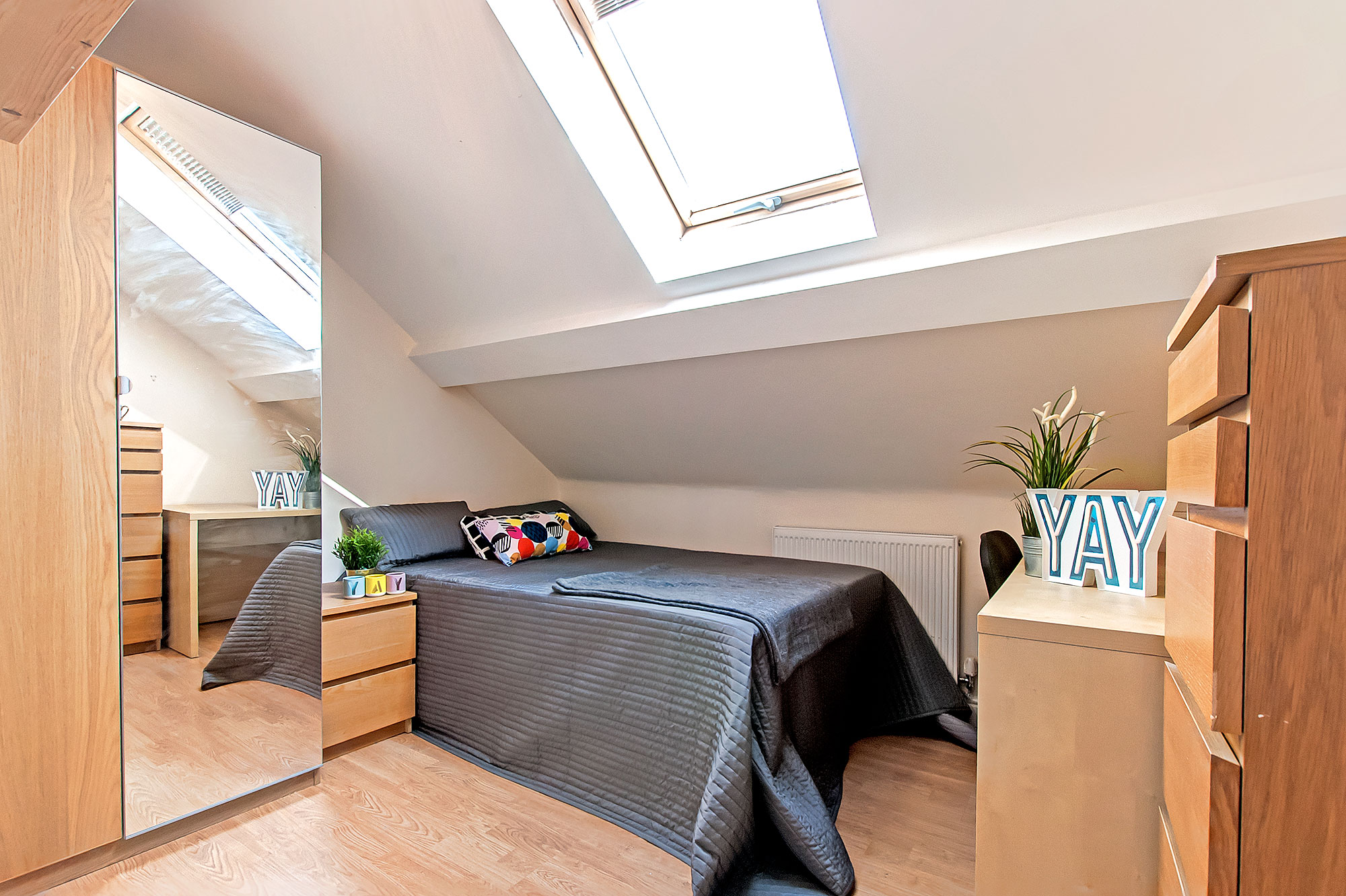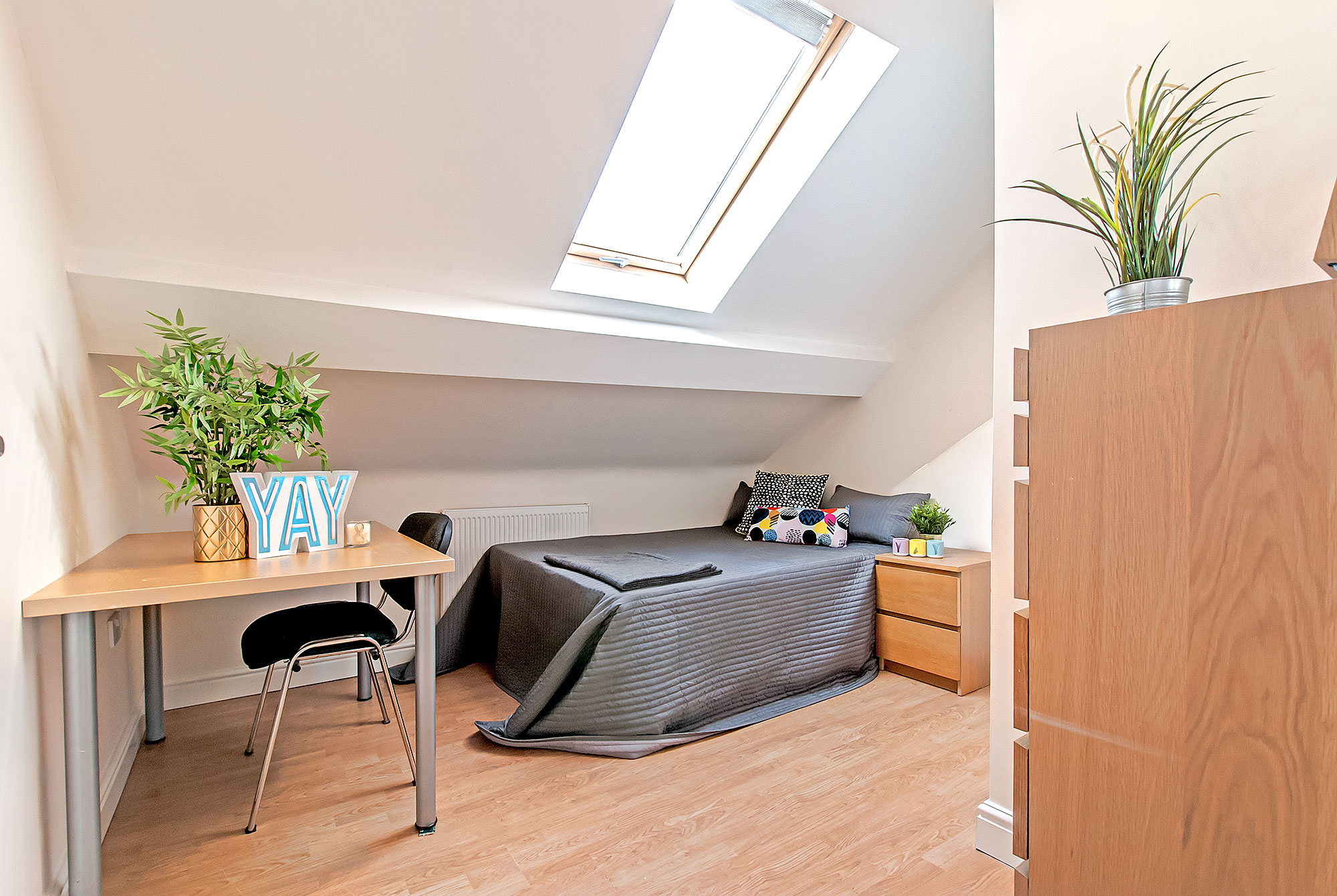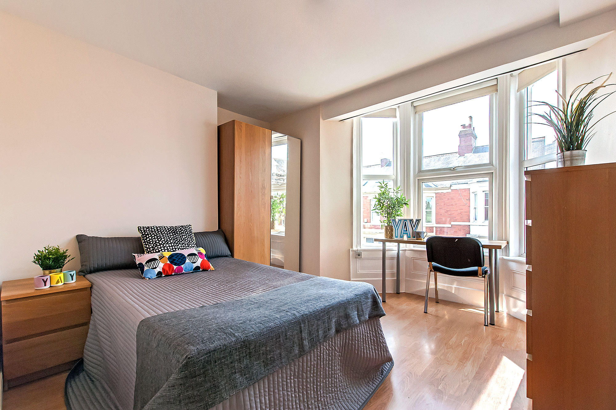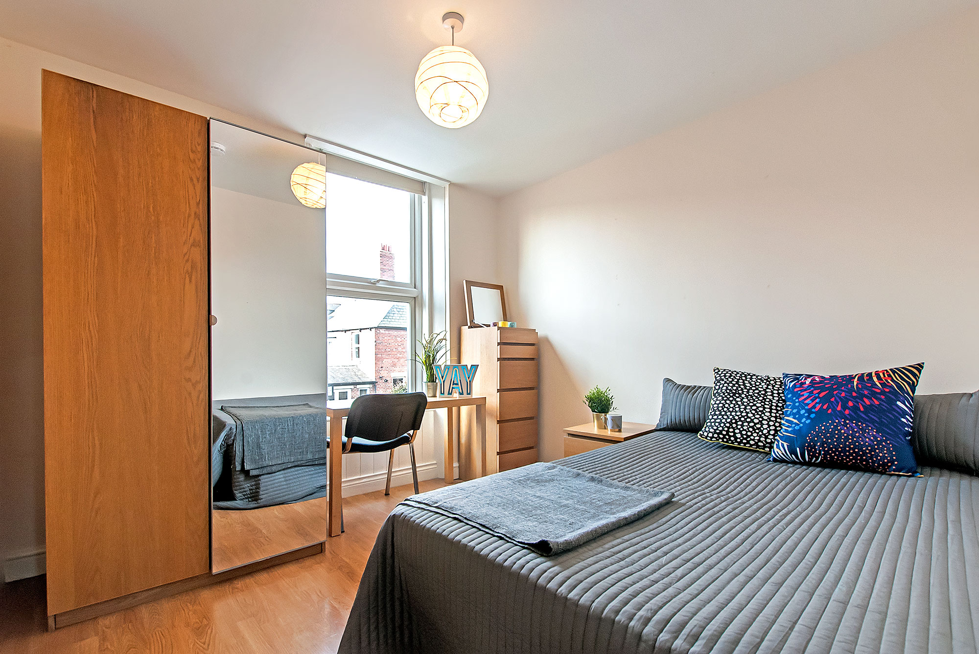 Six equal sized double bedrooms fully furnished with high spec ikea wardrobe, chest of drawers, desk, chair, bed, and bedside table