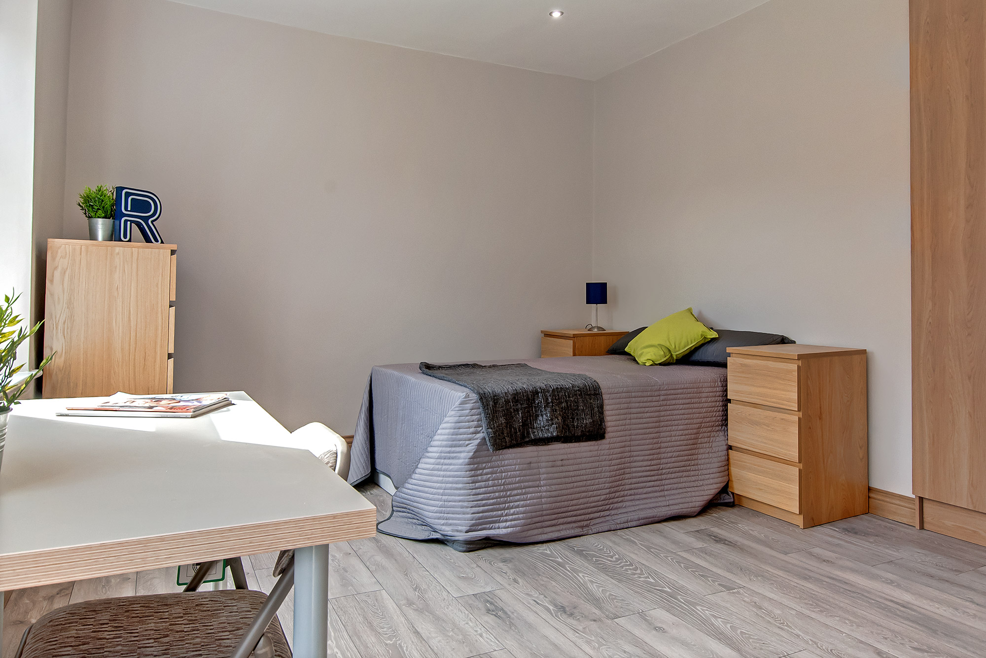 2 large bedrooms fully furnished with wardrobe, chest of drawers, desk, chair, bed, and bedside table